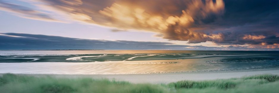 … die Panoramafotografie. Den Blick meist nach Westen gerichtet. Vom Atlantik kommt unser Wetter, die ziehenden Wolken, wie Komparsen auf der Bühne. Wind, Wellen, Wolken und Sonne sind meine täglichen Begleiter. Sie sind die Darsteller im Theater Nordsee, das gut ausgeleuchtet ein faszinierendes Schauspiel bietet.