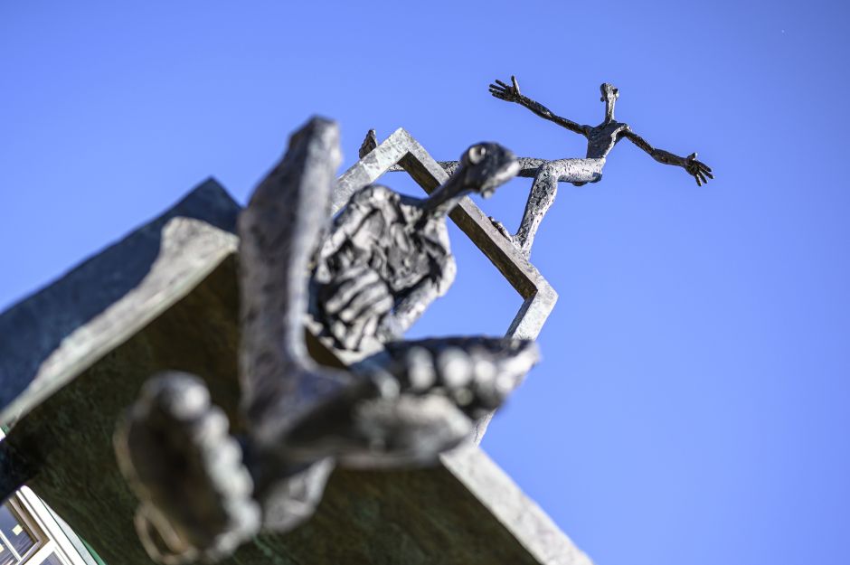 Florian Fock, Schulleiter von Deutschlands einzigem Inselinternat, suchte viele Jahre nach dem gewissen Etwas. Etwas Eigenem. Ein kleines Kunstwerk, das Gesicht und Seele der Schule nach außen repräsentiert. Schön anzusehen, eine Schöpfung, welche zum Denken anregt und zum Handeln anstiftet – und gleichzeitig das erst kürzlich renovierte Hauptgebäude der Hermann Lietz-Schule vervollständigt. Dass aus dem kleinen Kunstwerk eine über sechs Meter hohe Bronze-Skulptur wurde, verdankt er dem Kölner Bildhauer Hannes Helmke, der mit „Mut zum Wagnis“ ein künstlerisch ausdrucksstarkes Statement vor die Backsteinfassade setzte. Der Name ist gleichzeitig Programm, und die überdimensionale Figur ist der in Bronze gegossene pädagogische Leitgedanke der Schule und ihres Gründervaters Alfred Andreesen. Am 19. Mai wurde sie offiziell eingeweiht.