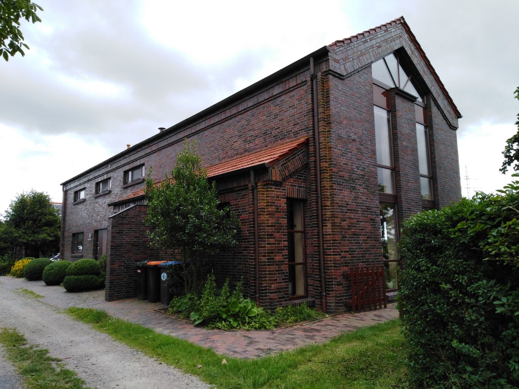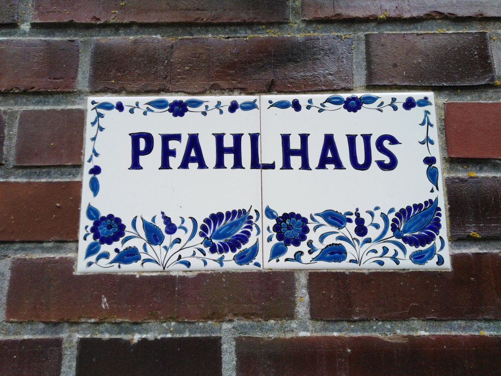Die nächste Piste probiert, der „Gross Charlottengroden“ heißt, und ja, hier gibt es nach einigen schnurgeraden Kilometern eine kleine Straße zur Rechten, die wieder südlich zurück führt, und zwar immer geradeaus zur Reitsportanlage „Ponyhaus“, oder direkt auf den – Juchhu!– „Pfahldeichsweg“. Und auf dem liegt man dann gold(!)richtig, denn der bringt einen sogleich zum „Pfahlhaus“. Was man glücklicherweise daran erkennt, dass der Name in großen Lettern am Gebäude prangt. Dabei handelt es sich jedoch nicht um ein historisches Zollhäuschen, wie vermutet, sondern um ein modernes Backsteindomizil mit Solarmodulen auf dem Dach.