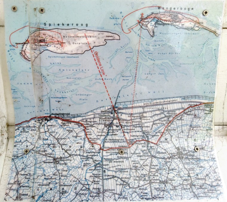Auch am anderen Ende der Grenzlinie ist der Eindruck hinsichtlich der Präsentation des Kulturguts nicht wirklich überzeugend. In Carolinensiel-Harlesiel ist heute das Festlandende der „Goldenen Linie“. Damals, vor mehr als 350 Jahren, war das alles noch kein Land, existierte weder der eine, noch der andere Siel. Aber die Grenze gab es schon, auch wenn sie zu dieser Zeit über Wasser lief. Eine Straße der Gemeinde trägt heute ihren Namen, aber sie folgt nicht dem originalen, mit dem Lineal gezogenen Verlauf.