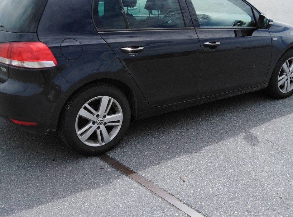Im Hafen von Harlesiel findet man dann doch noch einen Hinweis und sogar ein kleines Stück „Goldene Linie“. Aber auch hier muss man ein wenig suchen. Auf dem direkten Weg von Abfertigungsgebäude am „Anleger Harlesiel Ost“ hinauf zum Hafendeich passiert man die schon bekannte Informationstafel vom Museumsweg Carolinensiel und blickt sich wieder suchend um. Wo ist sie denn nun hier, die „Goldene Linie“? Da! Da ist sie! Man traut seinen Augen kaum: Auf dem Parkplatz, zehn Meter vor einem, läuft sie als Messingband-Intarsie von zirka 15 Metern Länge über den Asphalt: zweckentfremdet als Streifen für parkende Autos.