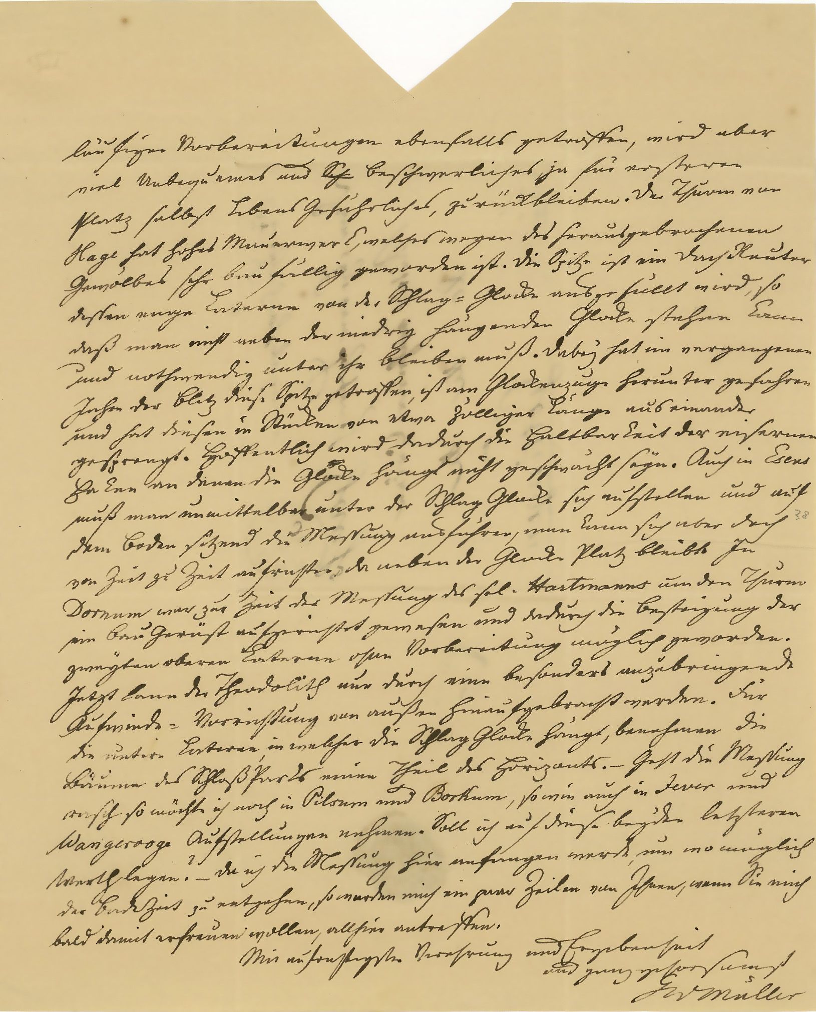 Der ehemalige Student von Gauß und spätere Hauptmann im hannöverschen Artillerieregiment war von den ersten Vorbereitungen in 1816 mit dabei. Er hat unermüdlich daran gearbeitet, unterwegs keine Strapaze gescheut, und selbst ein Schlüsselbeinbruch hat ihn nicht abhalten können, weiterzumachen. Außerdem hat er wundervolle Briefe geschrieben, die heute noch ein unglaublich lebendiges Bild von den Messungen an der ostfriesischen Küste und auf den Inseln geben – ganz oben auf zugigen und schwankenden Kirchtürmen, im Wolkendunst von Moorbränden oder gepeitscht vom Flugsand – und von den Gefahren und der Abenteuerlust berichten, die es brauchte, um im Feld seine Messdaten zu gewinnen: Terra X in Briefen. Da Müller kurz vor der letzten, noch fehlenden Messung starb, konnte er sein großes Lebensprojekt nicht mehr selbst beenden. Das hat Gauß Junior übernommen und ist somit in die Annalen eingegangen.