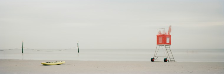 Der Horizont ist kaum noch auszumachen in diesem Panoramabild aus türkisfarbenem Blau. Alles verschwimmt im Hintergrund und gibt dem Orange des Leuchtfeuers, das sich im Wasser spiegelt, seinen großen Auftritt. Kräftige Farben, die die Nordsee an diesem Tag, in diesem speziellen Moment, gemalt hat. Festgehalten 2009 auf Norderney von Deff Westerkamp, der seit vielen Jahren die Meereslandschaften seiner Heimat mit der Panoramakamera portraitiert.